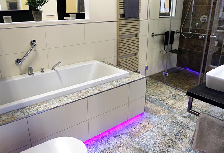 - LED-Beleuchtung kann direkt ein Bad in eine Wohlfühloase verwandeln und hilft sehschwachen Menschen bei der Orientierung.